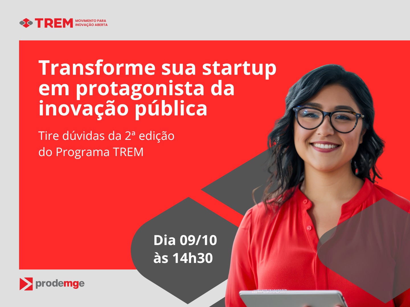 O edital da segunda edição do programa TREM – Movimento para Inovação Aberta está publicado e a Assessoria de Inovação da Prodemge realiza uma live na quarta-feira (9/10), às 14h30, para informar detalhes sobre a iniciativa que busca parceria com o mercado privado para a melhoria de processos e serviços públicos.